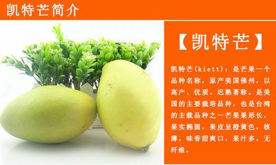 凯特芒果该品种树势强壮。果实呈卵圆形,果皮淡绿色向阳面及果肩呈淡红色,单果平均重量680克,皮薄核小肉厚,果肉橙质,含糖分17%,迟熟种,成熟期 8 月至 9 月中旬。该品种现在我区广西百色市田东县种植有一定的面积和产量。凯特是田东芒果 众多多品种中的一种,除此之外还有田东还种植有桂七芒果、金煌、台农一号、红贵妃 等等。 凯特芒果与其他芒果一样,都具有其很丰富的芒果营养价值 ,还可以制成多种芒果相关制品 。